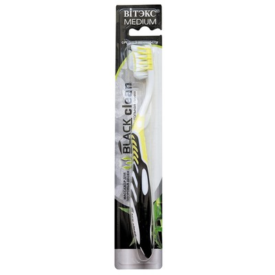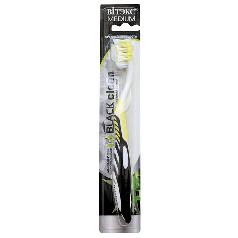 В отличие от обычных зубных щеток* зубная щетка Black Сlean с массажером с разнонаправленными щетинками средней жесткости более эффективно очищает зубной налет, а специальные резиновые зубчики мягко массируют десны во время чистки.