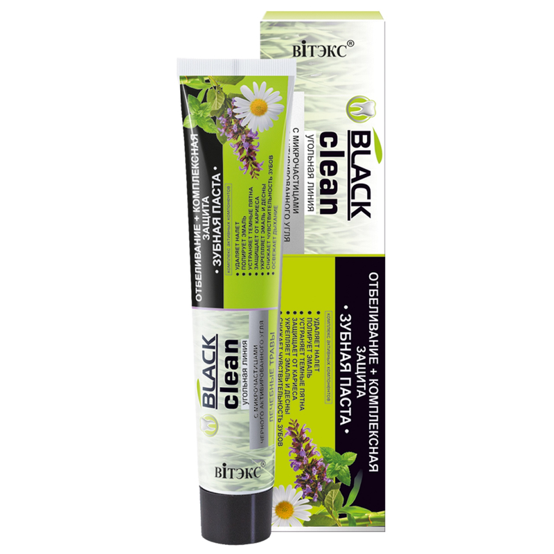 комплекс активных компонентов- УДАЛЯЕТ НАЛЕТ- ПОЛИРУЕТ ЭМАЛЬ- УСТРАНЯЕТ ТЁМНЫЕ ПЯТНА- ЗАЩИЩАЕТ ОТ КАРИЕСА - УКРЕПЛЯЕТ ЭМАЛЬ И ДЁСНЫ- СНИЖАЕТ ЧУВСТВИТЕЛЬНОСТЬ- ОСВЕЖАЕТ ДЫХАНИЕЗубная паста с микрочастицами черного активированного угля и лечебными травами, благодаря специальным активным компонентам, эффективно отбеливает зубы, не повреждая эмаль и обеспечивает комплексную защиту зубов и полости рта.