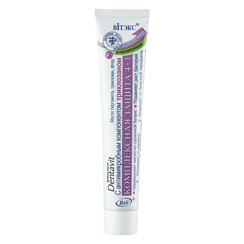 Активные ингредиенты: фторид натрия (1300 ppm фторид-иона); пирофосфат натрия, триклозан, масло бергамота