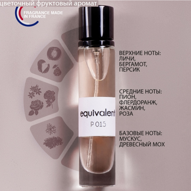 "EQUIVALENT" P015 - Необычный, притягательный аромат начинается с нот бергамота, личи и персика. Сердце аромата раскрывается потрясающим белоцветочным звучанием жасмина, пиона и апельсинового цвета. Древесно-мускусная база подчеркивает красоту звучания основного аккорда. Аромат создает атмосферу ранней весны, акварельные образы нежных бутонов и предчувствие любви. Основные ноты: личи, бергамот, персик, пион, жасмин, роза, мускус, дубовый мох.